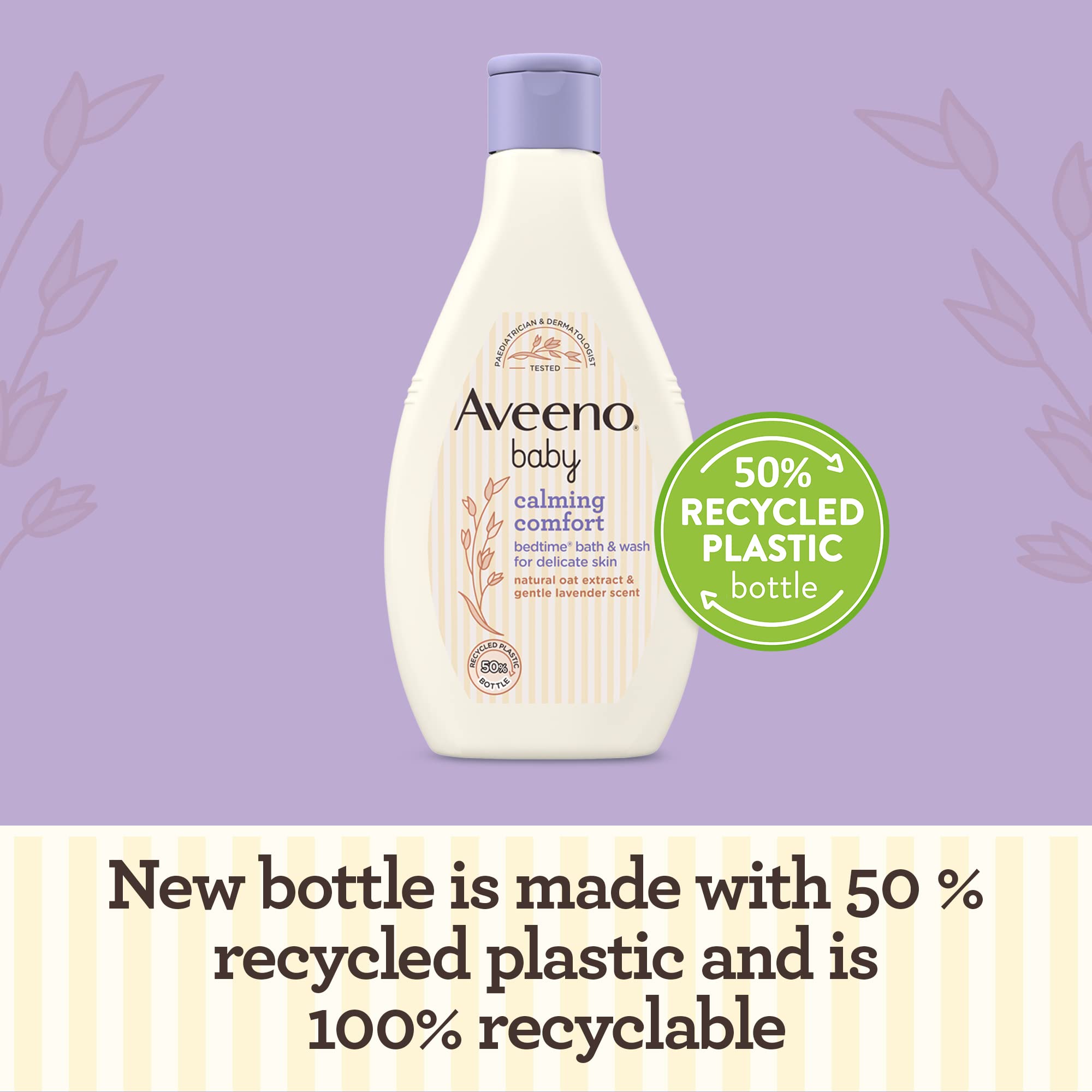 Formulated to be gentle enough for baby’s delicate skin, AVEENO Baby Calming Comfort BedtimeBath & Wash is blended with soothing natural oat extract, a soft aroma of vanilla and the calming scent of lavender, and helps calm your baby before bedtime. AVEENO Baby Calming Comfort BedtimeBath & Wash’s gentle formula is designed to preserve your baby’s skin microbiome. It is pH-balanced, tear-free and leaves your baby’s skin feeling clean, nourished and healthy-looking. This Bath & Wash bottle is made with 50 % recycled plastic and is 100% recyclable. The AVEENOBaby 3-step routine is a clinically proven routine which helps your baby fall asleep faster and stay asleep longer. It consists of warm bath, massage, and quiet time. routine consists of bath, massage & quiet time. Tested on babies 7 months+, 1 week+ use