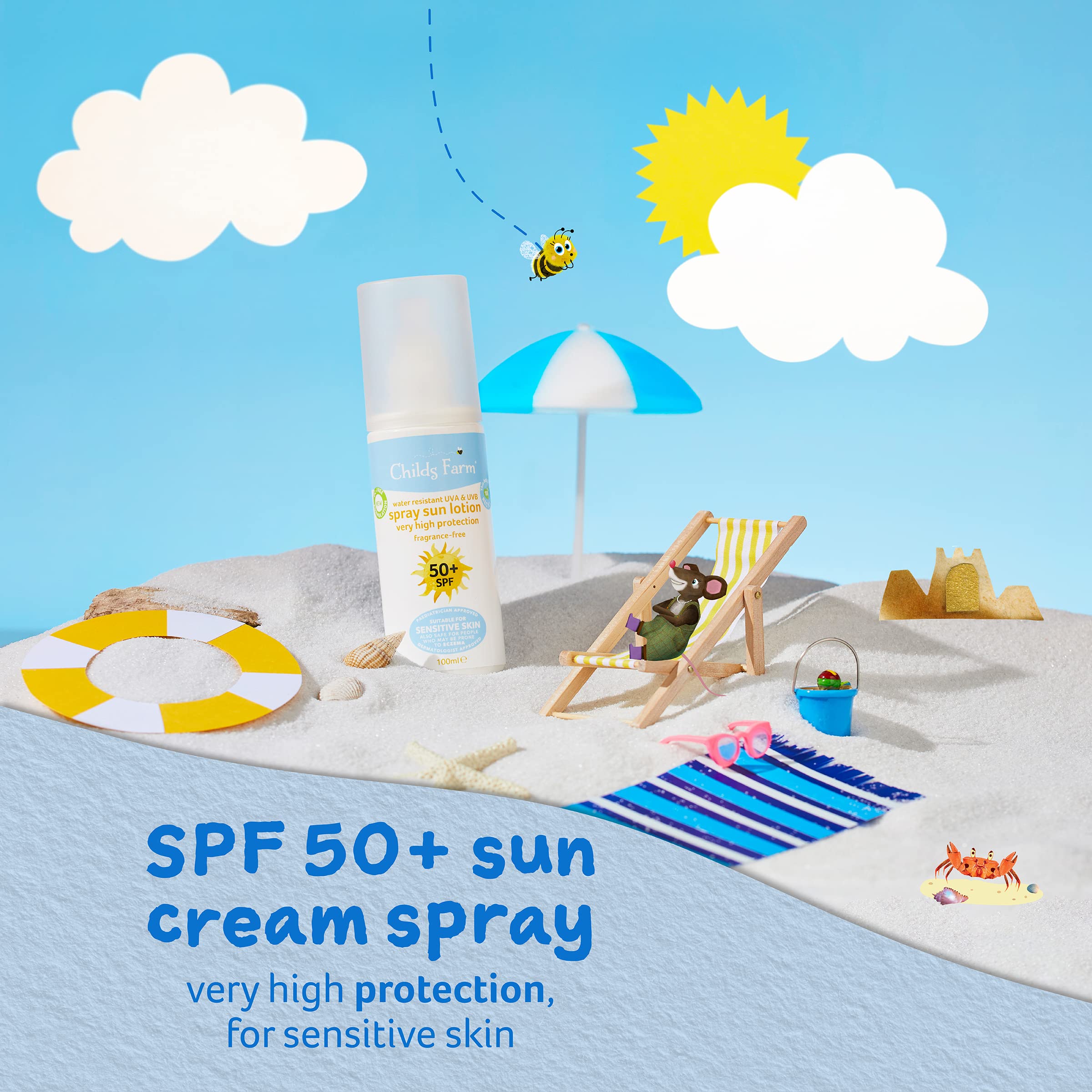 Childs Farm Kids and Baby Sun Lotion Spray SPF 50plus Water Resistant UVA and UVB Very High Protection Suitable for Dry, Sensitive and Eczema-prone Skin 100ml