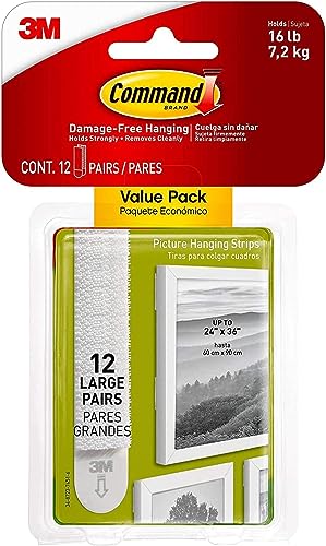 Details: Make decorating quick and easy with Command Large Picture Hanging Strips. You can hang large framed prints with no need for power tools. Our large strips lock together to hold up to 7.2 kg of weight, and when you are ready for a change can be easily removed without damaging the surface underneath. No holes, damaged paint work or sticky residue. The decorating possibilities are endless, and they are a great nail free solution for rented accommodation where you may be worried about damaging walls. They hold strongly to a variety of surfaces including solid, hollow and painted walls. Large picture hanging strips hold most frames up to 60 cm x 90 cm.