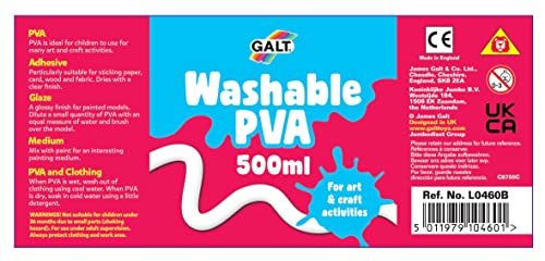 Galt Washable PVA Glue for Crafting, 500ml – Slime Making Easy Clean Kids Glue, Washes Out of Clothes – Clear Arts and Crafts Glue for Paper, Card, Wood and Fabrics – Children Safe, Ages 3 Years Plus