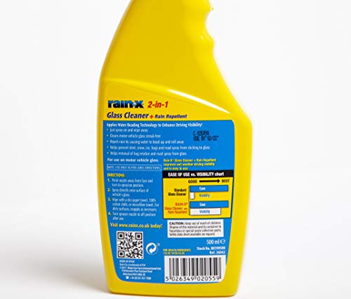 Rain X 2 in 1 Rain repellent and Glass Cleaner improves wet weather visibility and safety by creating an invisible hydrophobic coating that repels rain, sleet and snow.The coating also makes for easy removal of ice,salt,mud and bugs.Ideal for car windscreens,side and rear windows and even headlights. Please be aware that it is not recommended for use on plastic surfaces. The 2 in 1 Rain X Rain Repellent also has the added bonus of glass cleaner included. This helps to leave your windows streak free and removes bugs, residue and road spray. Rain X Rain Repellent helps improve visibility upto 1 second earlier. For example, if driving at 60mph, the stopping distance could be improved upto 90ft.A major safety issue when driving in wet weather.Easy to use and apply, simply apply to the microfibre cloth and wipe onto the exterior of your windscreen/windows using a circular motion. Reapply as necessary. This product will last upto 60days, please reapply frequently for maximum results.