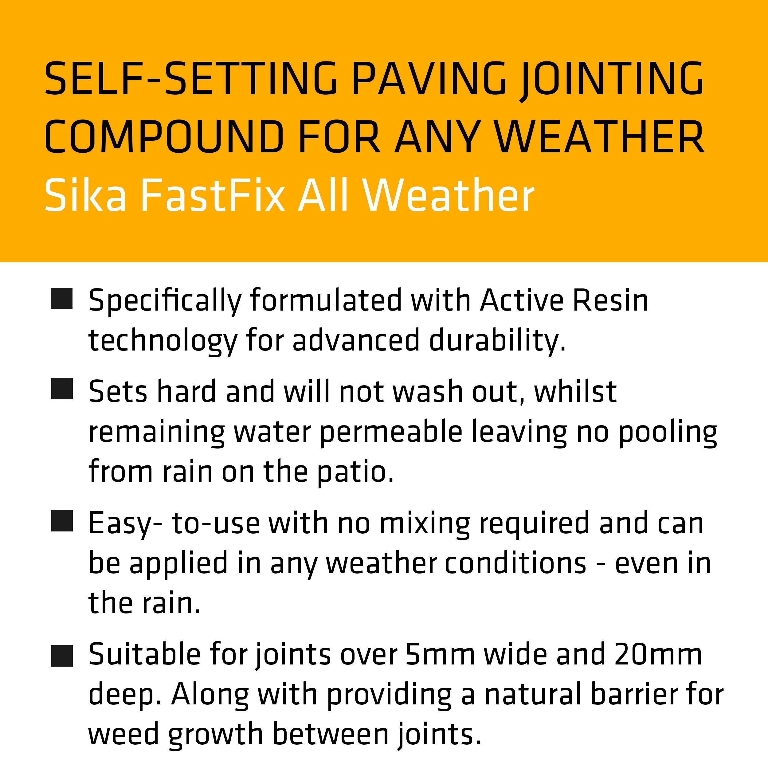 Details: Sika FastFix All Weather is a self-setting paving jointing compound providing the ideal solution to perfect pointing on paving, paths and patios. With a unique formula containing Active Resin Technology for advanced durability, it is ready to use with no mixing required, easy to apply in all weather conditions; even in the rain and won’t shrink or crack over time. Suitable for use on all joints from just 20mm deep, Sika FastFix can be used for a range of applications including footpaths, stone setts, cobbles and Indian sandstone paving slabs and once opened can be stored in water and reused to reduce waste. Weed control – provides a tural barrier for weed growth Suitable for use on: Flagstones Cobbles Indian sandstone Stone setts Paving blocks Slabs Footpaths Patios Pavements Driveways with light vehicular traffic