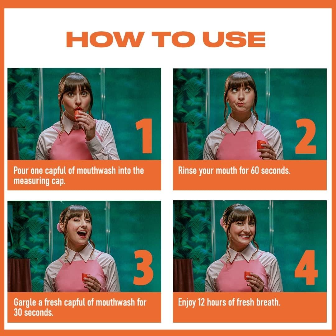 Fill dosage cup to mark. Rinse mouth for 1 minute with 1 cup-full. Gargle with another cup-full for 30 seconds to clean your throat, a major source of bad breath. Wait 5 minutes before eating. Repeat every 24 hours. For best results, use as part of a twice daily regime with The Breath Co toothpaste.